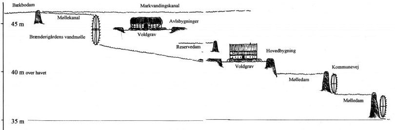 Vandet løber nu ind i Brejninggaards voldgrav, hvor adgangen med præsten Jens Lauridsen Handbjergs ord fra 1638 blev ”hindret dem, der hemmeligt ville trænge ind.” En del af vandet – nok til at holde graven fri for råd og mosedannelse – går rundt om gården og ledes ud i dalen, men det meste går kun gennem det sydvestlige hjørne af graven og videre til mølledammen.