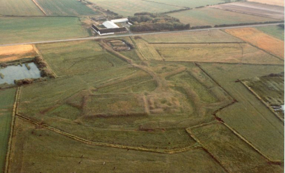 Luftfoto af den tidligere herregård Timgaard, set fra nord. I 1801 fik ejeren, spekulanten Hans Jakob Lindahl tilladelse til at nedrive og udparcellere Timgaard. Efterfølgende blev parcellen overpløjet og dyrket. I dag er de små bakker og forhøjninger på marken det eneste vidnesbyrd om herregårdens grumme skæbne. Foto: Ringkøbing-Skjern Museum.