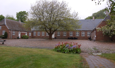 Midterfløjen står i røde sten, mens sidebygningerne er hvidkalkede. Bygningen er stråtækt.