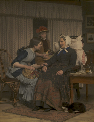 Endnu mod slutningen af 1800-tallet skyldte tjenestefolk herskabet lydighed, men kunne også omvendt forvente sig en vis traditionsbetinget omsorg fra herskabets side, når f.eks. et langt tjenesteforhold afsluttedes. Sygebesøg hos det gamle tyende, malet af Frederik Vermehren (1823-1910) i 1884. Statens Museum for Kunst.