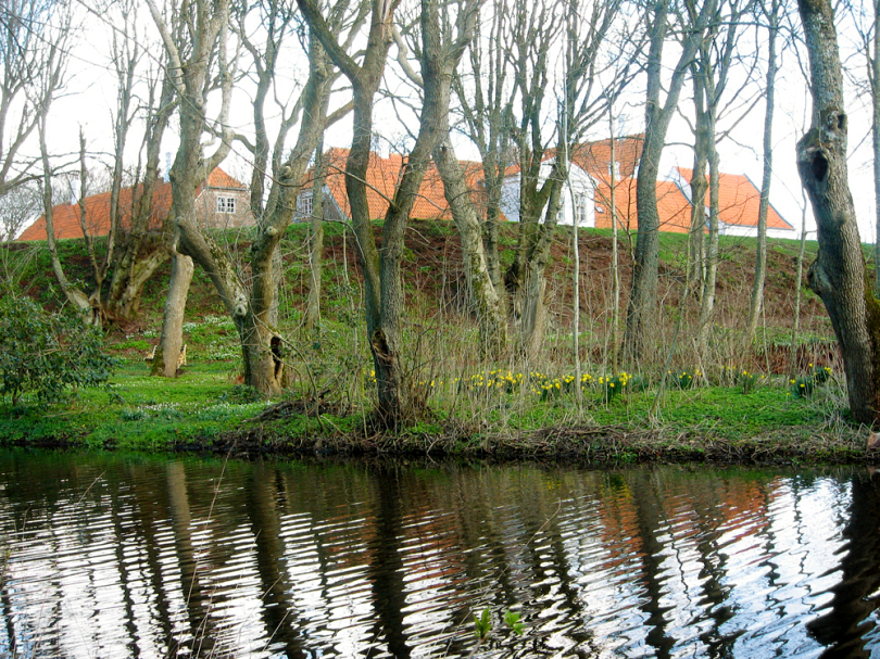 The moat, dikes and ramparts of Nørre Vosborg are from the 1570s when Predbjørn Gyldenstjerne established his new manor house at this place. Behind the tall rampart, the buildings were well protected from the rough wind and weather of West Jutland. As seen in the picture they still do. Originally, the area was unplanted, but today there is a lush and atmospheric, woody park. Facing north-east. Photo: Helle Henningsen.