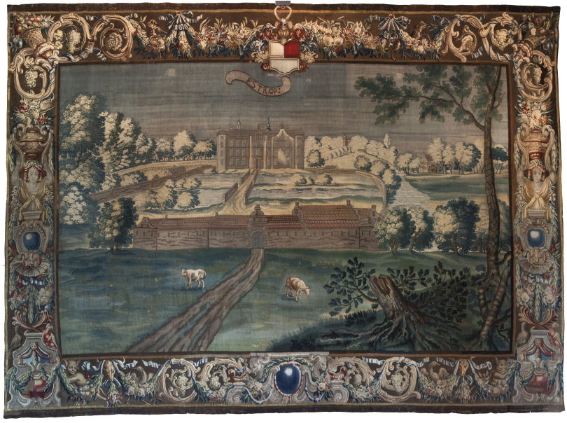 Den største gobelin fremstiller Skeelernes hovedsæde, Gammel Estrup, og er opdelt i flere sektioner, der hver især indfanger facetter af herregårdens liv og omgivelser. En smule forskudt fra midten træder Gammel Estrup frem som et monumentalt byggeri med de to markante hjørnetårne og spir samt fremskudte gavle. Omkring denne figur udfolder sig landskabet, kirken, møllen, haven, avlsgården og dyrene, som tilsammen indrammer og komprimerer hele godsets herligheder og resurser. Farverne er stærke, selvom de må formodes at have været endnu stærkere, med en dominerende brug af grønne nuancer, der understøtter gobelinens landlige og aristokratiske tema. Det grønne knytter sig til naturen og den magt, herregården udøver over landskabet, mens landbrugsbygningerne og de to stude i forgrunden afspejler herregårdens økonomiske grundlag. Deres tilstedeværelse er nært knyttet til den lukrative forretning, som studeopdræt udgjorde for herremændene - et klart symbol på handel og velstand. Studene på Gammel Estrup har sandsynligvis ikke gået på et græsareal foran avlsgården, men er, som så mange andre ting, bevidst blevet placeret i forgrunden.