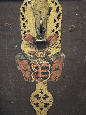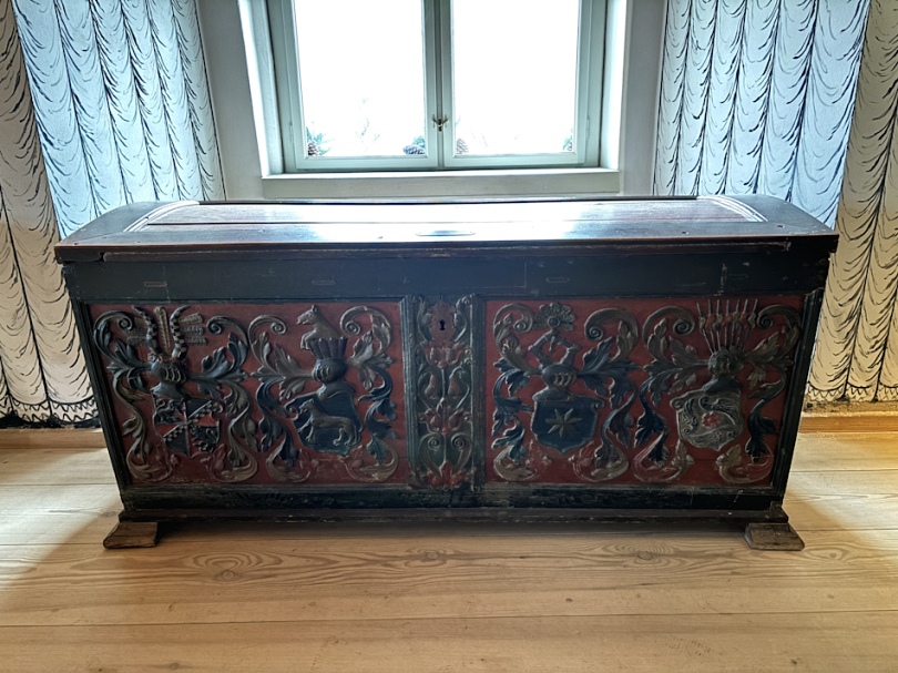 Kristine Styggesdatter Rosenkrantz blev i 1582 gift med adelsmanden Niels Skram til Urup. Hendes brudekiste var, som det var typisk for renæssancens brudekister, udskåret egetræ. Forsiden var inddelt i to felter, som var indrammet af profillister. De blev udfyldt af våbenudskæringer, hvor bunden var malet rød. I det vestre felt ses bedstefædrenes våbenskjold Rosenkrantz og Knob, mens det andet felt har bedstemødrenes våbenskjold efter slægterne Gyldenstjerne og Walkendorff. Foto: Dansk Center for Herregårdsforskning.