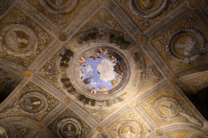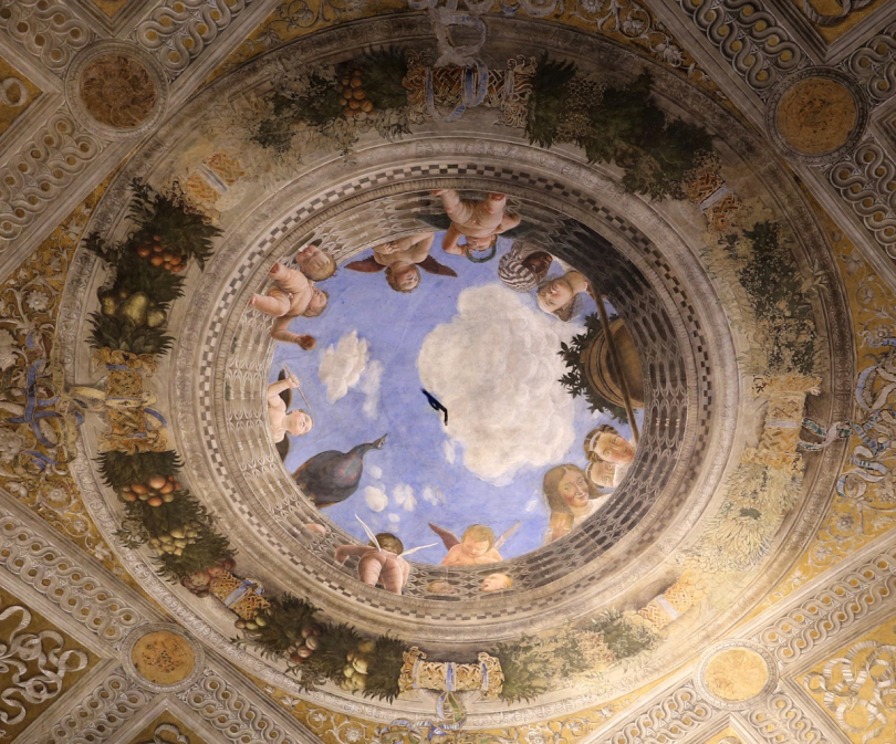 Camera degli Sposi loftsudsmykning baserer sig alt andet lige på en noget mere avanceret geometri end Næsbyholmloftet, men forkærligheden for de perfekte figurer cirklen og kvadratet går igen. I medaljonerne, der omgiver det centrale felt ses portrætter – ikke af familiemedlemmer som det formodentlig er tilfældet på Næsbyholm – men af romerske kejsere. Foto: Wikimedia Commons.