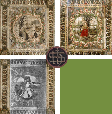 Kristusmonogrammet optræder hyppigt i udsmykningen af datidens kirkeinventar, på udstyr til boligen og som motiv for de smykker datidens adelskvinder bar. Som det f.eks. ses på Birgitte Rosenkrantz portræt nedenfor, så ejede hun selv netop et smykke i form af et stort Jesusmonogram med indlagte mørke sten. Med et sådant monograms placering midt på loftet, midt i det af bjælker dannede kors, der opdelte loftet i fire lige store felter, figurerede Kristus som det diskrete men uomgængelige centrum omkring hvilket årets gang udfolder sig – det uforanderlige omdrejningspunkt for tiden og menneskets afvekslende tilværelse.