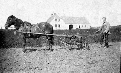 Statshusmændene efter 1919-loven, de såkaldte jordrentebrugere, forstod sig selv som landmænd på trods af, at jorden tilhørte staten, og muligheden for at blive selverhvervende landmand var for mange landarbejdere en attraktiv mulighed. Hvis det ikke lykkedes, og man måtte forlade husmandsstedet igen, var nederlaget ofte meget tungt. På billedet er det medlemmer af familien Vest ved statshusmandsbruget i statshusmandskolonien Lundby tæt ved Gammel Estrup. Foto: Søren Albert Rasmussen.