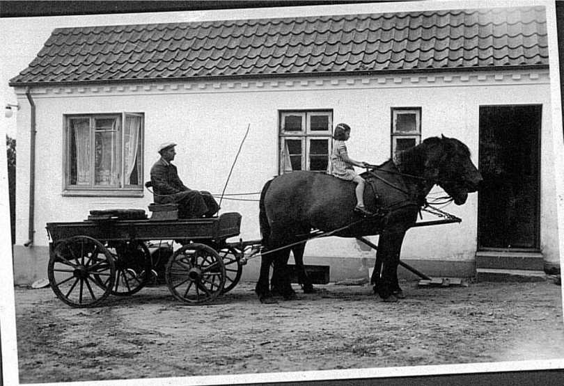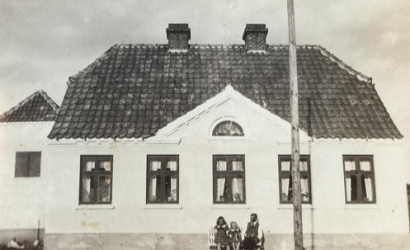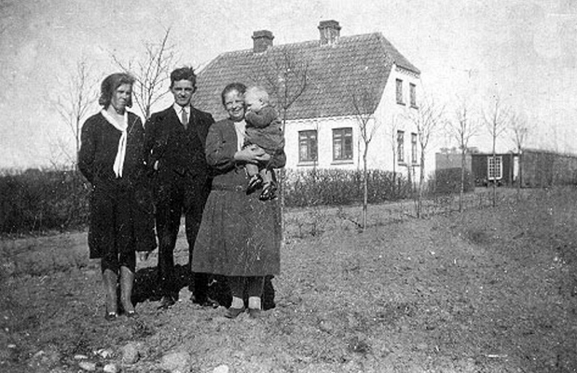 På billedet ses Sofie Kristine Pedersen med sin bror og sit barn på armen samt en ukendt kvinde. Sofie ejede sammen med sin mand Peder Gerhardt Pedersen statshusmandsbruget i baggrunden i årene 1929-1943. Med undtagelse af tandsnitsfrisen er stuehuset opført i overensstemmelse med foreningen Bedre Byggeskiks principper om praktiske bygninger og fravær af unødige dekorationer. Foreningen fik stor indflydelse på bygningernes arkitektoniske udtryk ved de mange statshusmandsbrug oprettet i forbindelse med lensafløsningen. Foto: Sønderhald Egnsarkiv.