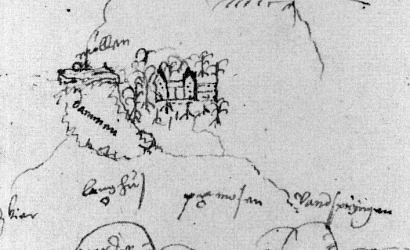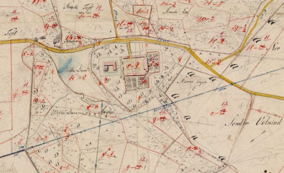Vi går tættere på. Nu kan vi se, at borggården er tegnet som et trefløjet anlæg. Det er bemærkelsesværdigt, for vestfløjen blev revet ned allerede omkring 1750. Den er da også ved en revision omkring 1810 overstreget med blåt.