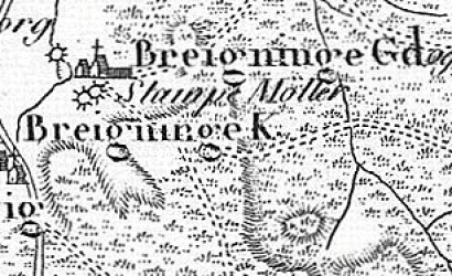 Korttegneren C. Wessel giver os en hel række oplysninger. Vi ser, hvordan gården benævnes ”Breigninge Mølle og Gaard” – i sig selv et stærkt signal om vandkraftens betydning. Der er da også hele tre tydelige møllesignaturer, hvoraf de to syd for borggården er felberedernes ”Stamp Møller”. Vi fornemmer også forbindelsen mellem Brejninggaard og kirkebyen, hvor en nord-syd-gående vej møder vejen fra Ringkøbing i vest.