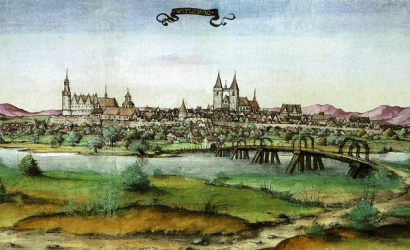Wittenberg var blot en mindre provinsby og fæstning før reformatoren Martin Luther gjorde den til centrum i den protestantiske bevægelse fra 1517 og frem. På Holger Rosenkrantz’ tid havde byen dog mistet en del af sin status som centrum, og universitetet var derfor meget begejstret, da en søn af en af Danmarks mest betydningsfulde adelige gjorde sin entré i byen. Den berømte teolog Polykarp Leyser tilegnede i 1593 sin tiltrædelsesforelæsning som professor i Wittenberg til Holger Rosenkrantz og kaldte ham for ”du morgenstjernen blandt universitetets adelige”. Prospekt af Wittenberg 1536. Universitätsbibliothek Würzburg. Foto: Wikimedia Commons.
