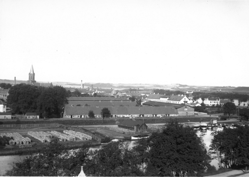 Hovedgårdens hovedbygning og ladebygninger fra 1770’erne lå midt mellem det kommende fabrikssamfund og den vordende by. Fabrikant Michael Drewsen opslog sit foreløbige hovedkvarter i hovedbygningen i årene 1844-1847, men han havde ingen planer om at blive boende der. Derimod kunne fabrikssamfundet bruge de eksisterende ladebygninger, Østre og Vestre længe, til arbejderboliger.