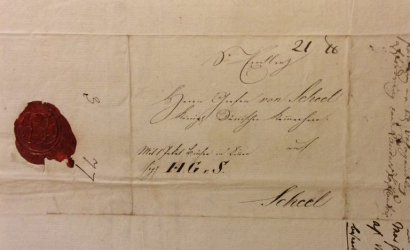 Tingene kom langvejs fra til herregården. På billedet ses Jørgen Scheels adresse på et af de hyppige breve fra boghandler Bohn i Hamborg. Den simple anvisning ”Herr Graf von Scheel auf Scheel” bragte en ny sending bøger sikkert hele vejen fra Hamborg til herregården i Gjerrild Sogn på Djursland. Fra grevens leverandører af møbler i København blev bestillingerne afsendt med skib til Randers, hvor købmanden Rasmus Hansen og senere hans enke tog imod og opbevarede pakkerne, indtil de kunne fragtes videre med vogn de sidste ca. 60 km ud på Djursland til herregården. Foto: Gammel Estrup Danmarks Herregårdsmuseum.