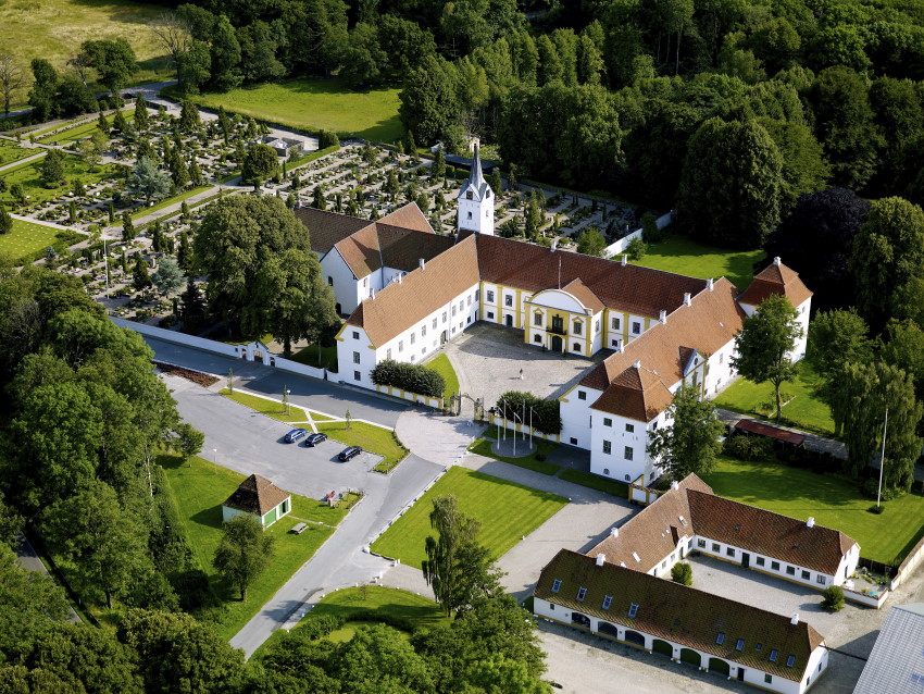 Den hvid- og gulkalkede hovedbygning er et trefløjet anlæg i to etager.