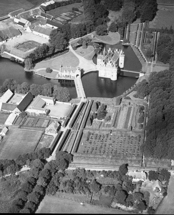 Luftfoto af Egeskov Slot med haven og det omkringliggende landskab, 1932-1950. Foto: Aero Ekspress. Det Kgl. Bibliotek.