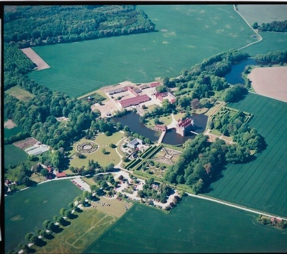 Luftfoto af Egeskov Slot med haven og det omkringliggende landskab, 1990. Foto: Ariel/Dansk Luftfoto. Det Kgl. Bibliotek.