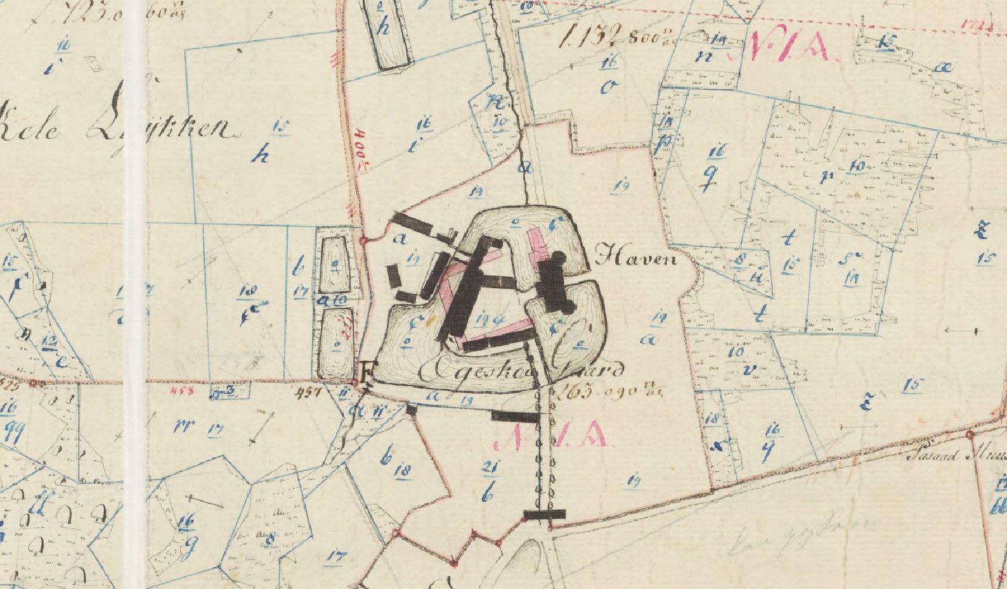 Matrikelkort over Egeskov slot, med haven øst for slottet, 1810. Billede: Geodatastyrelsen.