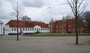 Hovedbygningen omgives af voldgrave mod nord, syd og vest.