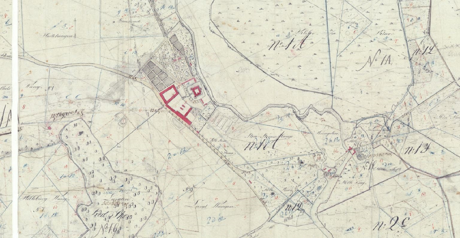 Matrikelkort over Gl. Estrup, med haven og orangerierne placeret nord for herregården, 1803. Billede: Geodatastyrelsen.