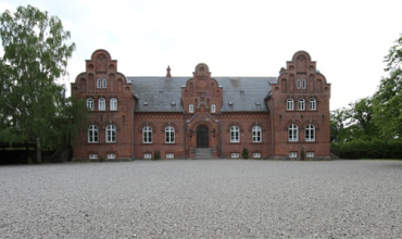 På gårdsiden mod syd er opført et rundt tårn i tre etager. Hele bygningen er opført i røde sten med skiftertag.