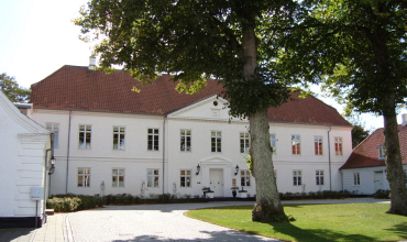 Hovedbygningen ligger på et voldsted omgivet af vand til alle sider.