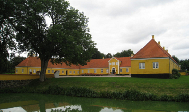 Den nye hovedbygning fra 1973 ligger omgivet af voldgrave på tre sider.