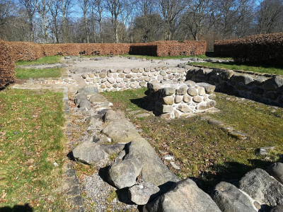 Fundamenterne fra Vilhelmsborgs tidligere hovedbygning øst for den nuværende hovedbygning, der blev udgravet i 1977-1978. Foto: Anders Sinding.