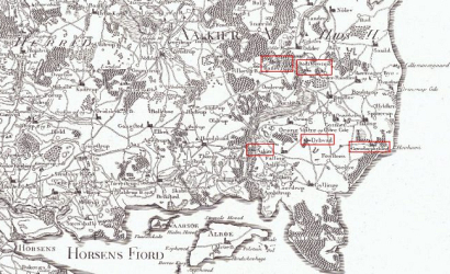 Aakær amt i 1789. På kortet ses herregårdene Aakær, Gersdorffslund, Rodsteenseje, Dybvad og Rathlousdal, der blev oprettet i årtierne efter Karl Gustav-Krigene (1657-1660). Foto: Geodatastyrelsen