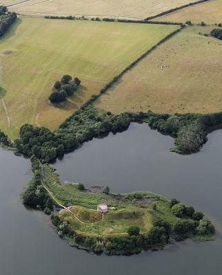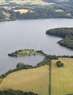 Luftfoto over ruinerne ved Hald Sø set fra nord. Her lå bispens gamle borg, som senere blev sæde for de kongelige lensmænd til Hald len. Foto: Lis Helles Olesen.