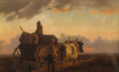 Hans Smith (1839-1917) var mere end nogen anden dansk kunstner hedens maler. På dette maleri, som er udstillet på Herningsholm, ses et studekøretøj med bønder, der kører tørv hjem. Ud over at være en yndet handelsvare blev de midt- og vestjyske stude også anvendt i transportsammenhæng. Foto: Museum Midtjylland.