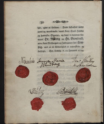 Det var vigtigt at lade trykke en fundats, der i detaljer fastsatte betingelserne for Stiernhielms hospital. Det skete i 1774. Der var jo ingen nær efterslægt, der kunne påtage sig et fremtidigt tilsyn. På den sidste side har Niels Jacobsen, Anna Maria Wandborg og Jens Wandborg de Stiernhielm sat deres underskrifter og røde seglaftryk. Foto: Rigsarkivet, Legatprotokol for Niels Jacobsens Legat 1774.