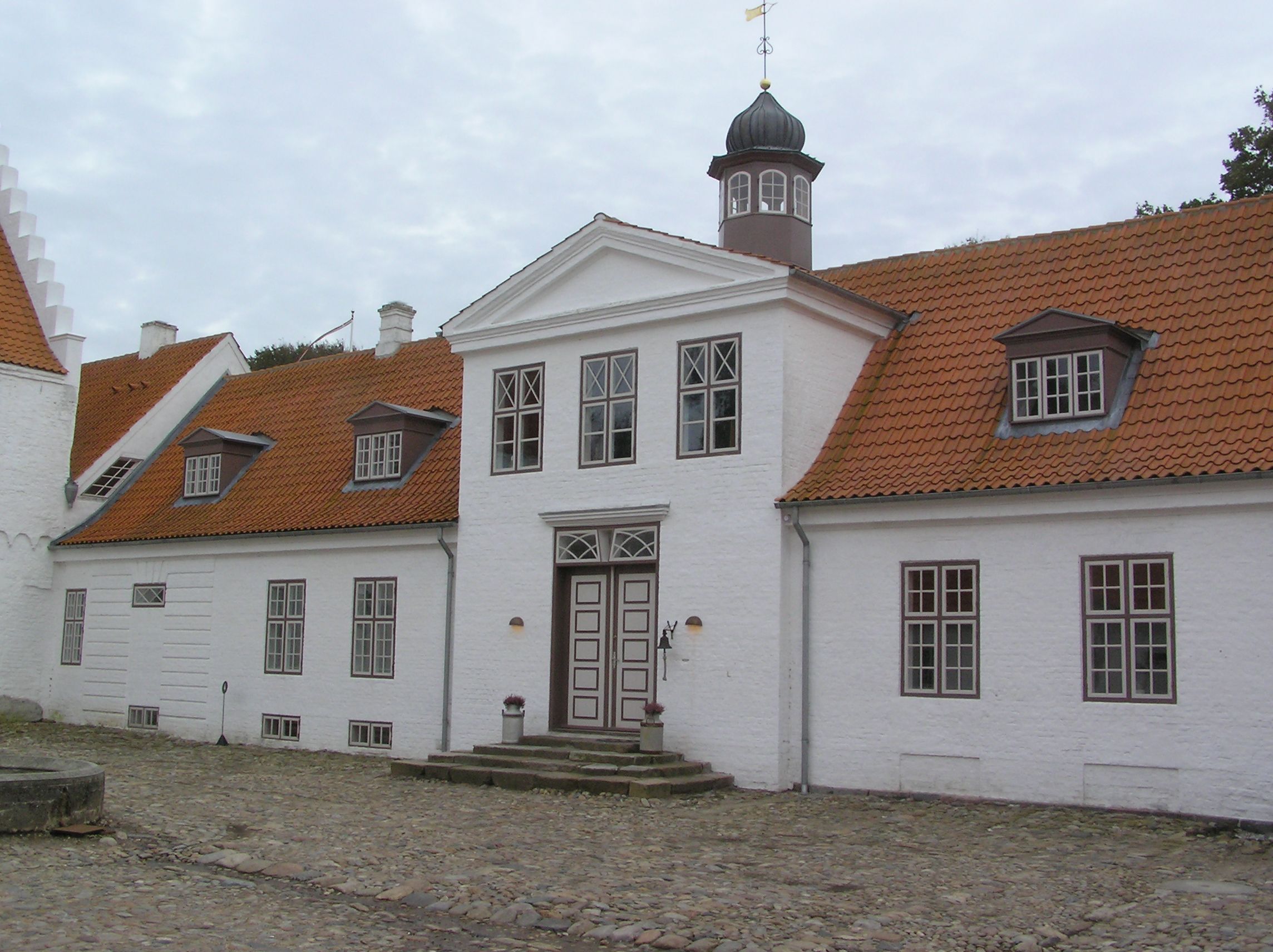 Borggårdens statelige østfløj kaldes Gyldenstjernehuset efter bygherren, rigsråd Predbjørn Gyldenstjerne, der lod huset opføre omkring 1575 som bolig for sig og sin familie. Det grundmurede, toetages hus er herregårdens ældste bevarede bygning, og gennem århundrederne har det undergået flere ombygninger. På et tidspunkt var stueetagen gennembrudt af en køreport, der gav adgang til gårdspladsen, men i forbindelse med Peder Tangs ombygning af huset i slutningen af 1790’erne blev porten nedlagt. De fire gamle lindetræer mellem broen og huset er rester af en allé, der førte frem til porten. Set mod vest. Foto. Helle Henningsen.