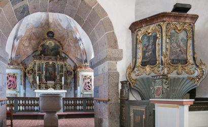 Nørlem kirke er en herregårdskirke i miniature, en overraskelse, når man går ind ad døren i den enkle romanske bygning. Alt inventaret er smukt udskåret, forgyldt og malet i muntre farver – en total iscenesættelse, sat i relief af det højtidelige gravkapel med fire store og én lille kiste. Foto: Mads Krabbe.
