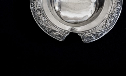 Dåbsfadet af sølv blev båret af en udskåren engel i træ. Hakket i fadets kant har passet til englens tommelfinger. På fadets underside har Jens Wandborg de Stiernhielm fået indgraveret en oversigt over alle de arbejder, han havde ladet udføre i kirken indtil 1769. Han giftede sig ikke igen, så der blev ikke født flere børn på Kabbel i denne families tid. Foto: Mads Krabbe.