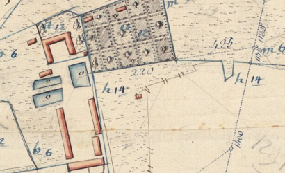 Vi zoomer ud og ser hele matrikelkortet for Kjeldgaard fra 1815 og efter salget af fæstegårdene. Kjeldgaard var stadig en meget stor gård, og som kortet viser, opretholdt herregården hovedparten af sine jordbesiddelser intakt til den nye ejer, præsten Frands Vilhelm Trojel. Han beholdt herregården i omtrent ti år, men Kjeldgaard blev i modsætning til andre herregårde ikke udstykket. Endnu i 1850 var herregårdens besiddelser på hele 35 tønder hartkortn. Foto: ’Kort over Hovedgaarden Kjeldgaard’ 1815 (udsnit), Geodatastyrelsen.