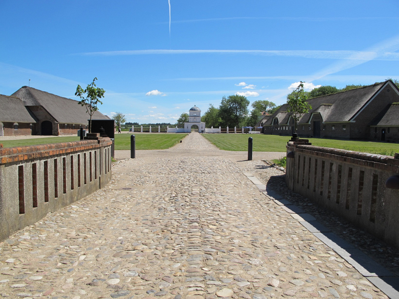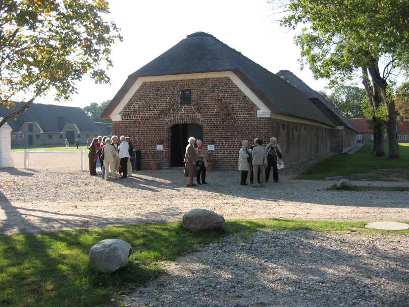 Nørre Vosborg er i dag et levende kultur- og konferencecenter, der hvert år besøges af tusindvis af gæster. Avlslængerne, der før rummede stalde og lader, er nu indrettet med teater-koncertsal, café, hotelværelser, foredragssale, mødelokaler og restaurantkøkken. I hovedbygningen er herregårdsstuerne i øst- og sydfløjen åbne for publikum, mens nordfløjen er indrettet med restaurant og vestfløjen med mødelokaler. Her ses nogle besøgende ved gavlen af Peder Tangs studestald, hvor der i dag er reception for hotel- og restaurantdelen. På gavlen over døren ses hans initialer PT og årstallet 1788. Set mod øst. Foto: Helle Henningsen.