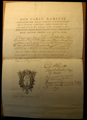 Den 7. maj 1796 fik Jørgen Scheel udstedt rejsepas af kongeriget Napolis gesandt i Rom, Don Carlo Ramette. Greven efterlod sine ting og en del af garderoben hos bekendte i Rom – formodentligt i den hensigt snarligt at vende tilbage efter dem. Jørgen Scheel blev dog snart opslugt af det skønne liv i Napoli, der i samtiden var berømt og berygtet for sit pragtfulde selskabsliv, sine maleriske omgivelser og samling af store personligheder. Først da en tilspidset krigssituation i kølvandet på Den Franske Revolution for alvor gjorde Napoli og andre europæiske byer usikre, vendte greven hjem til Danmark. Foto: Gammel Estrup Danmarks Herregårdsmuseum.