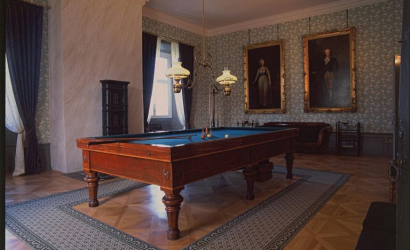 Christen Scheel og Christiane Pind blev gift i 1827, og dermed fik Gammel Estrup igen et ejerpar som boede på herregården. I stil med deres forgængere gennemførte parret en nyindretning af den gamle herregård, så Gammel Estrup kunne fremstå som en passende, herskabelig bolig i tidens stil. I Gammel Estrup Danmarks Herregårdsmuseum nyindretning fra 2015, blev der atter indrettet billardsal i hjørneværelset på anden sal. Foto: Gammel Estrup Danmarks Herregårdsmuseum.